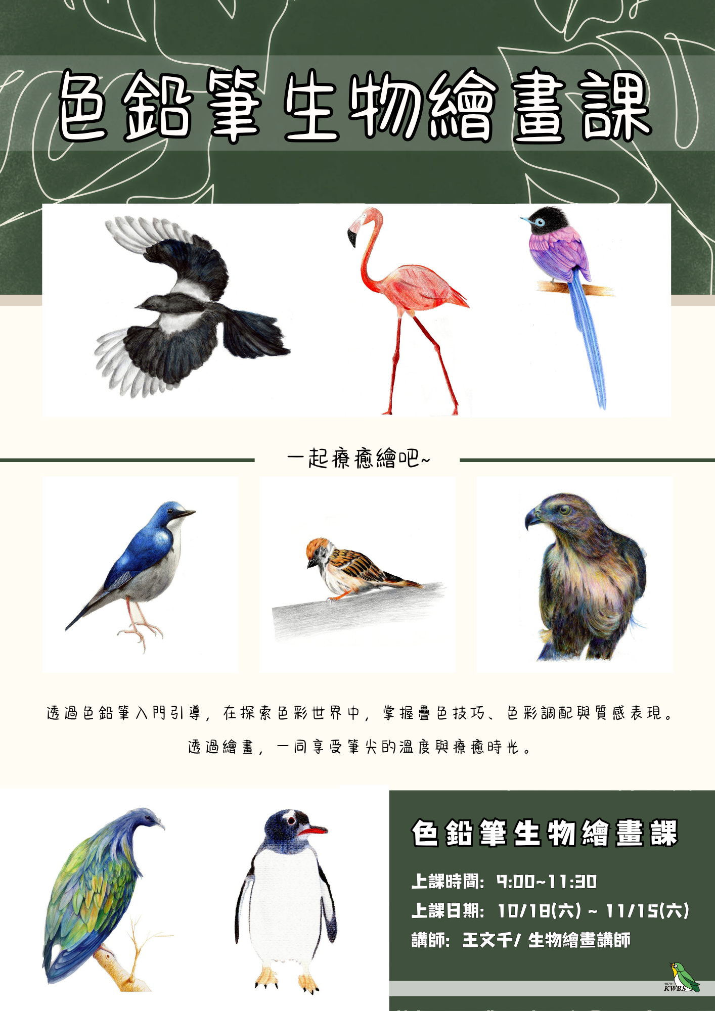課程將結合生物學知識與藝術表現,學習如何運用色彩層疊與筆觸,準確描繪鳥類的特徵與姿態,